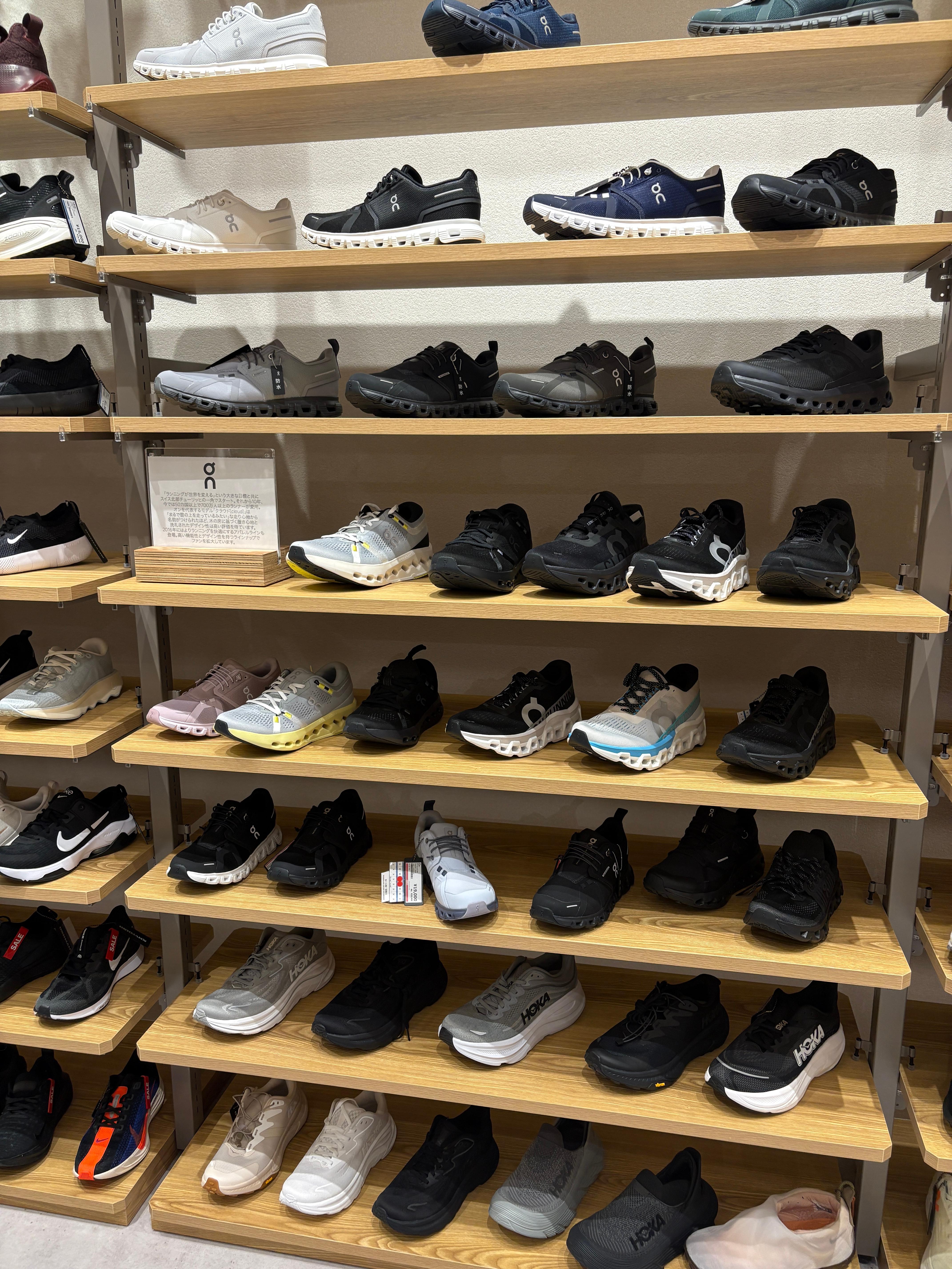 먼저 들른 곳은 나하 국제거리에서 가까운 스포츠데포 아메쿠점! 위치도 좋아서 렌트카로 10분, 택시로도 금방 도착할 수 있어요. 매장 규모가 엄청 커서 온러닝뿐 아니라 호카, 아식스, 나이키 등 다양한 스포츠 브랜드 신발과 의류가 가득해요. 저는 클라우드 6를 노리고 갔는데, 방수모델만 재고가 있더라규요 다만 뒤에서 설명해드릴 파르코시티에비해서 모델종류는 많았어요